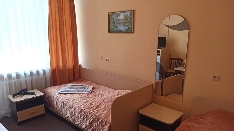 В номере: вешалка, зеркало, кровати односпальные, прикроватные тумбочки, тумба, шкаф, раскладушка на доп. место